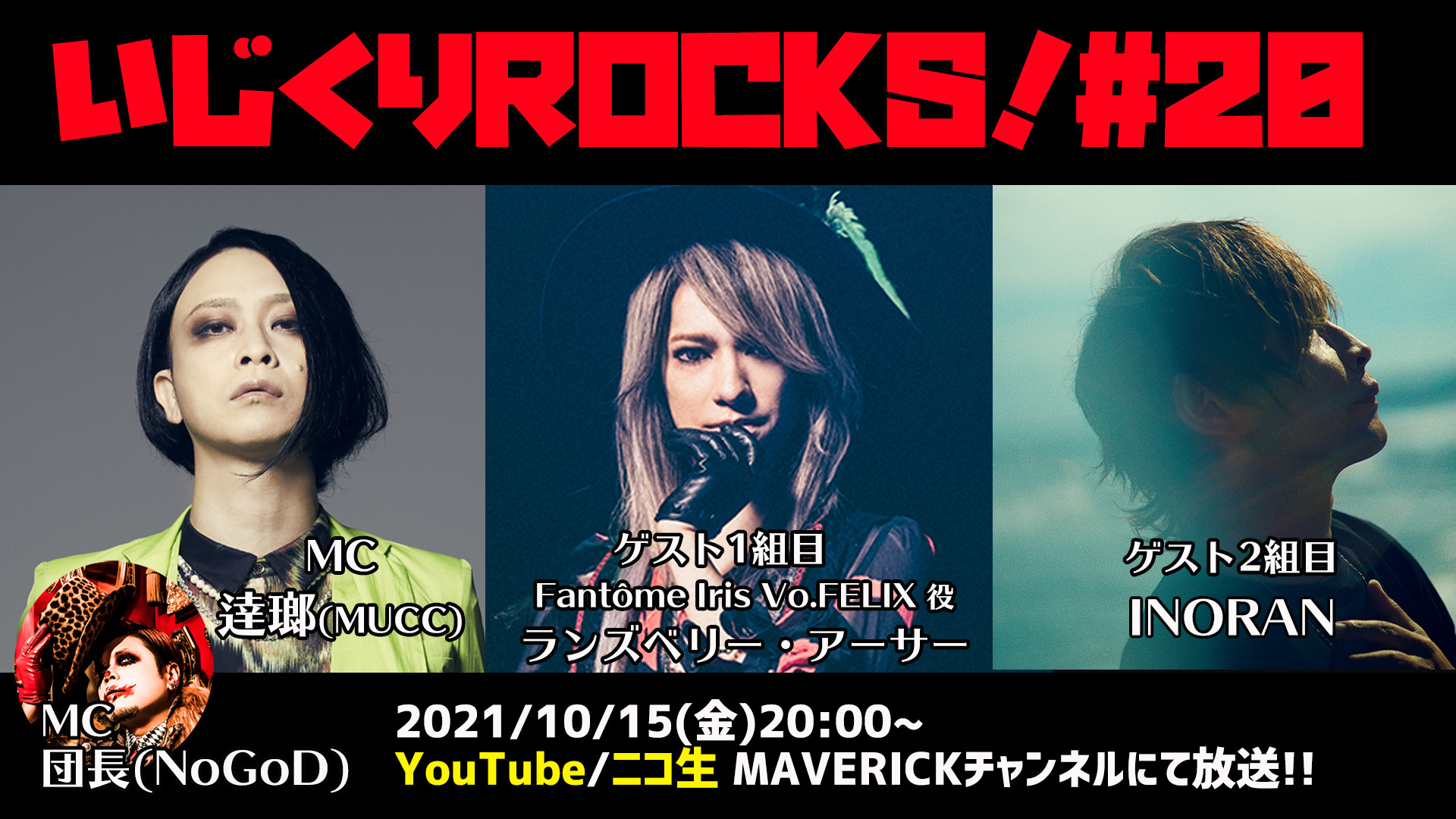 WEB 【逹瑯】音楽情報ライヴ『いじくりROCKS!#20』 11, Oct. 2021 【放送日時】 2021年10月15日(金)20:00〜 【出演】 逹瑯(MUCC)/団長(NoGoD) 【ゲスト】 1組目:Fantôme Iris Vo.FELIX 役 ランズベリー・アーサー 2組目:INORAN ニコニコ生放送MAVERICKチャンネル会員限定コーナーゲスト:庄村聡泰 【配信チャンネル】 ・ MAVERICK DC GROUP YouTubeチャンネル ・ ニコニコ生放送