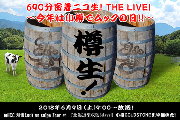 WEB ニコニコ生放送『690分密着ニコ生! THE LIVE! ~今年は小樽でムックの日!!~』放送決定 1, Jun. 2018 今年もムックの日に690分のニコニコ生放送が決定! 「MUCC 2018 Lock on snipe Tour #1『北海道型収監6days』」 小樽GOLDSTONE公演も完全生中継! 【放送日時】 2018年6月9日(土)9:00~ 番組ページはコチラ