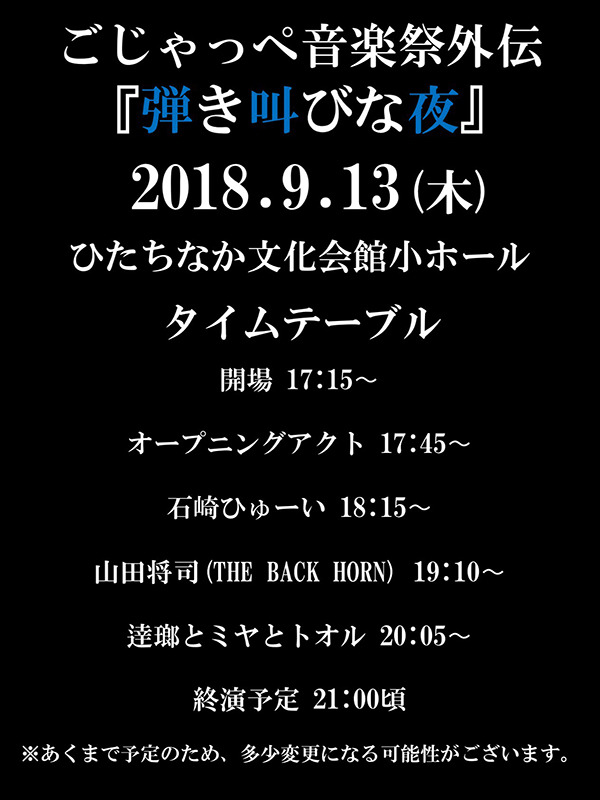 【逹瑯/ミヤ】逹瑯とミヤとトオル出演『ごじゃっぺ音楽祭外伝「弾き叫びな夜」』タイムテーブル発表・当日券情報