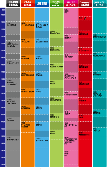 MUCC, ASPARAGUS, androp, Leo Ieiri, Itowokashi, VAMPS, Marie Ueda, WOMCADOLE, Mao Uchu, Aimer, Oisiclemelonpan, Hiroya Ozaki, Chihiro Onitsuka, the GazettE, Charisma.com, Kankaku Piero, KICK THE CAN CREW, QoN, Good Morning America, CreepHyp, Xmas Eileen, SILENT SIREN, Sakanaction, Sambomaster, Shout it Out, TANA-SYNDROME NEW!, Team Syachihoko, DJ Kazu NEW!, Tenpura DJ Agemaki a.k.a Ono Takemasa (KEYTALK) NEW!, TOTALFAT, NICO Touches the Walls, the HIATUS, Passepied, Perfume, BIGMAMA, Dai Hirai, 04 Limited Sazabys, FLOWER FLOWER, BRADIO, Plastic Tree, BLUE ENCOUNT, Friends, Berrygoodman, Bentham, Polkadotstingray, MY FIRST STORY, Momoiro Clover Z, LAMP IN TERREN, locofrank, LONGMAN