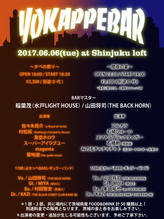 178R(よかっぺBARレギュラーバンド)、佐々木亮介(a flood of circle)、村松拓(Npthing's Carved In Stone)、真空ホロウ、スーパーアイラブユー、magenta、菊池遼(the quiet room)